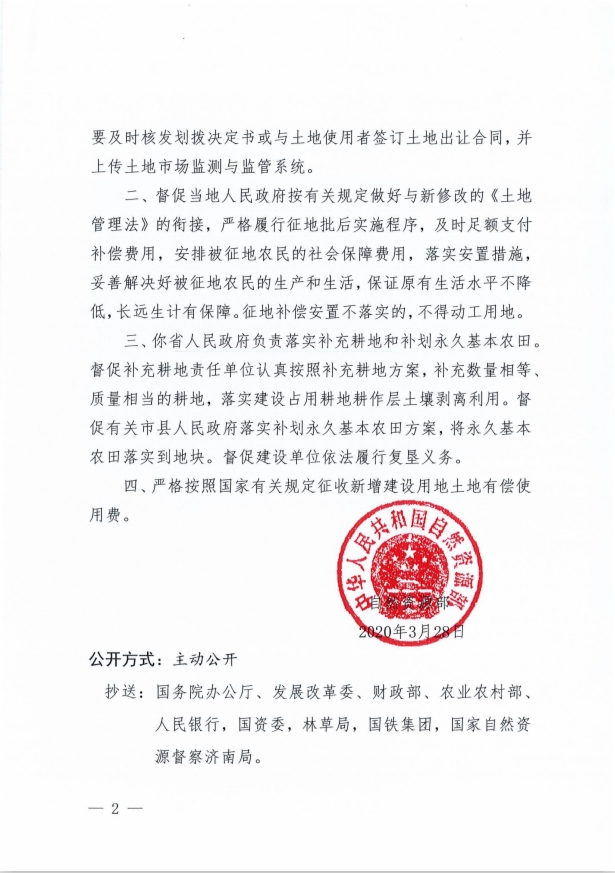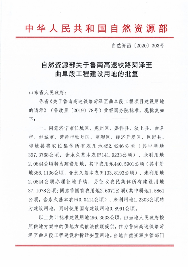 附:《自然资源部关于鲁南高速铁路菏泽至曲阜段工程建设用地的批复》(自然资函〔2020〕303号)