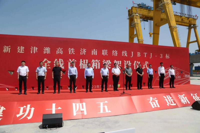 5月16日,在济滨高铁济阳制梁场架设现场,随着架桥机将首榀长32.6米重850吨的箱梁平稳、精准地落在济商1号特大桥的桥墩上,标志着济滨高铁全线首榀预制箱梁架设成功,项目建设顺利转入箱梁架设新阶段。