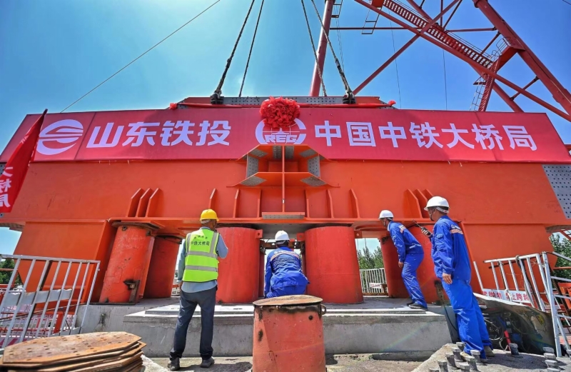 7月7日11时10分,随着现场总指挥一声令下,重达75吨的第一根钢桁梁下弦杆稳稳降落,精准安装在济阳黄河公铁两用特大桥主桥P40号墩顶,济滨高铁全线首节钢梁成功架设,标志着济阳黄河公铁两用特大桥建设迈入全新阶段。