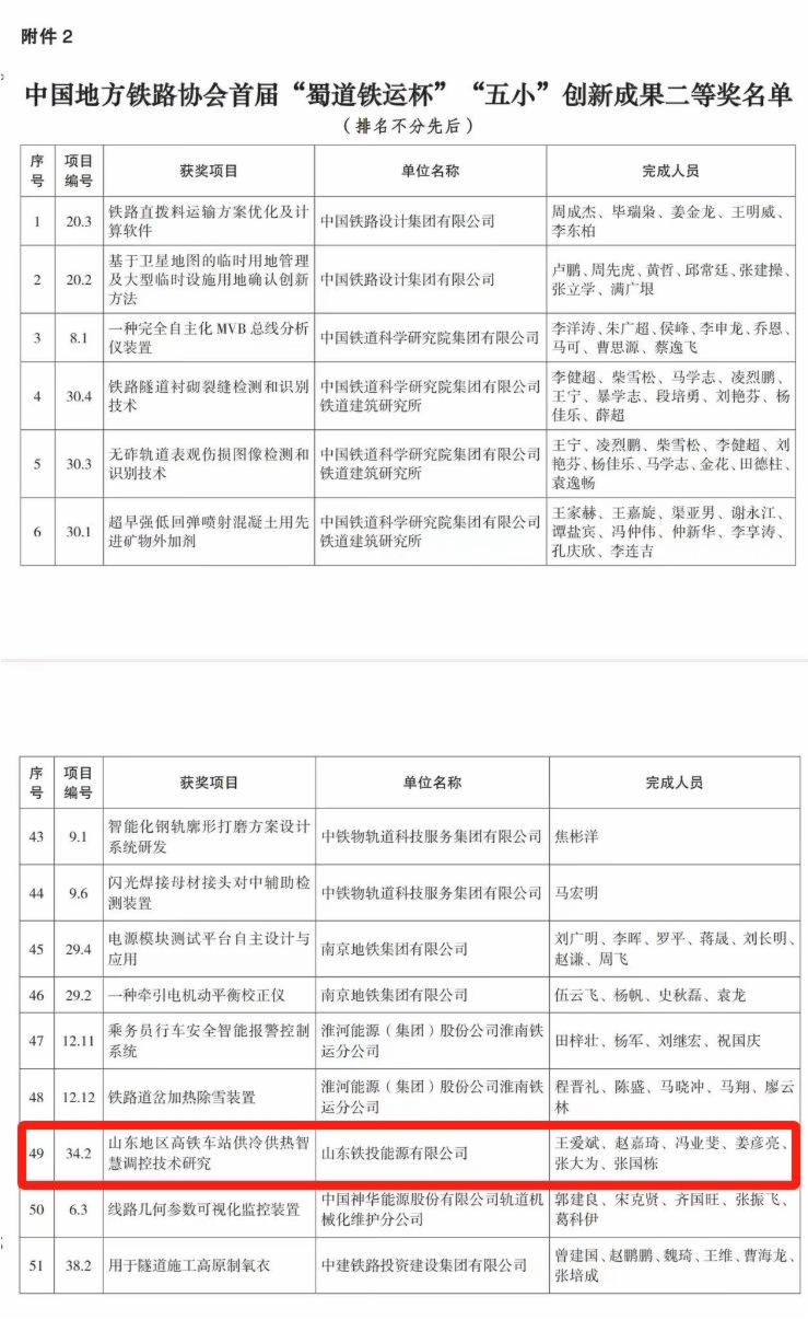 近日,成年人电影 能源公司打造的山东地区高铁车站供冷供热智慧调控技术研究项目获得中国地方铁路协会首届“蜀道铁运杯”“五小”创新成果二等奖,集团在科技创新应用方面再添新成果。