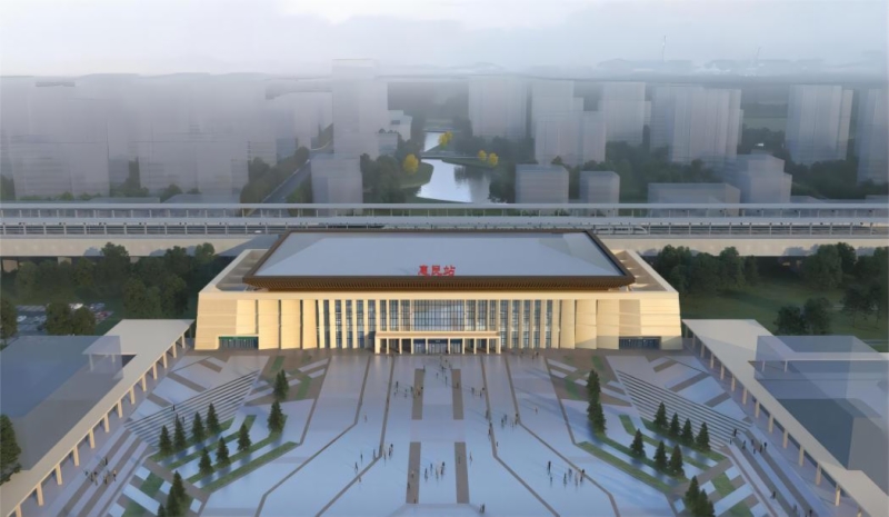 惠民站设计以“兵圣故里,雄阔惠民”为概念,车站设两座净宽10m的进、出站通道,两座长450m,宽12m渐变至9.05m的岛式站台,线侧下式站型,雨棚覆盖面积10547㎡,站房点建筑面积为9987㎡,建筑层数主体建筑地上一层,两侧局部设置二层夹层,地下局部一层。建筑总高度为23.45m,最高聚集人数为800人,站房主体结构计划2025年6月完工。
