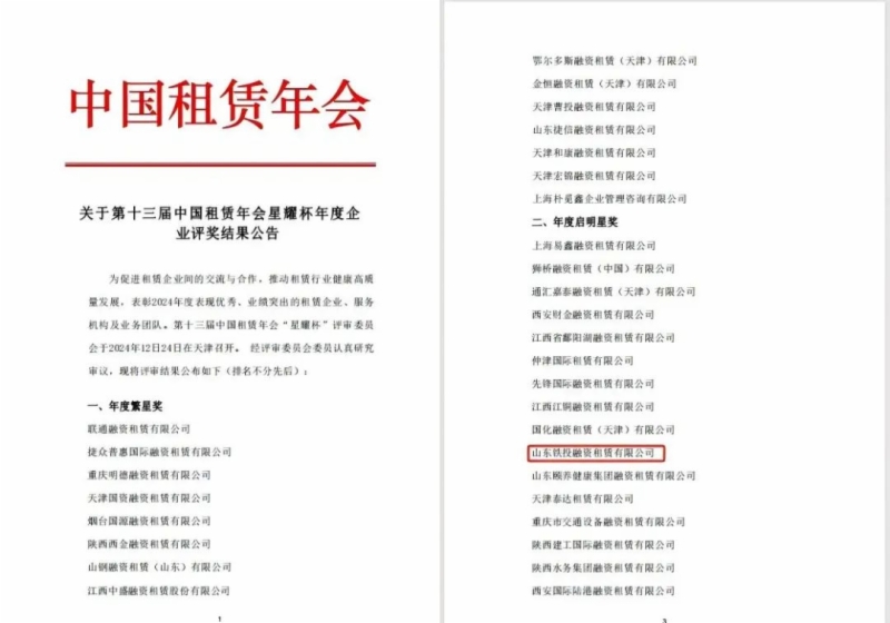 所属铁投租赁公司斩获“年度启明星”奖,该奖项旨在突出企业实施战略转型期间,对行业具有影响力和贡献力,能够树立良好榜样的企业。这也是铁投租赁公司2024年度继获得山东省融资租赁公司“高质量发展奖”荣誉称号后,获得的第二项年度荣誉。